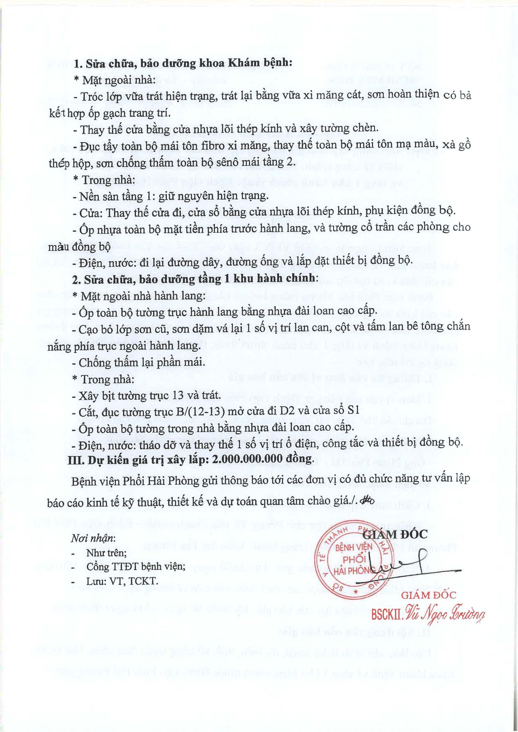 THÔNG BÁO MỜI BÁO GIÁ CUNG CẤP DỊCH VỤ LẬP BÁO CÁO KINH TẾ KỸ THUẬT, DỰ TOÁN, THIẾT KẾ CÔNG TRÌNH: SỬA CHỮA, BẢO DƯỠNG KHOA KHÁM BỆNH VÀ TẦNG 1 KHU HÀNH CHÍNH THUỘC BỆNH VIỆN PHỔI HẢI PHÒNG
