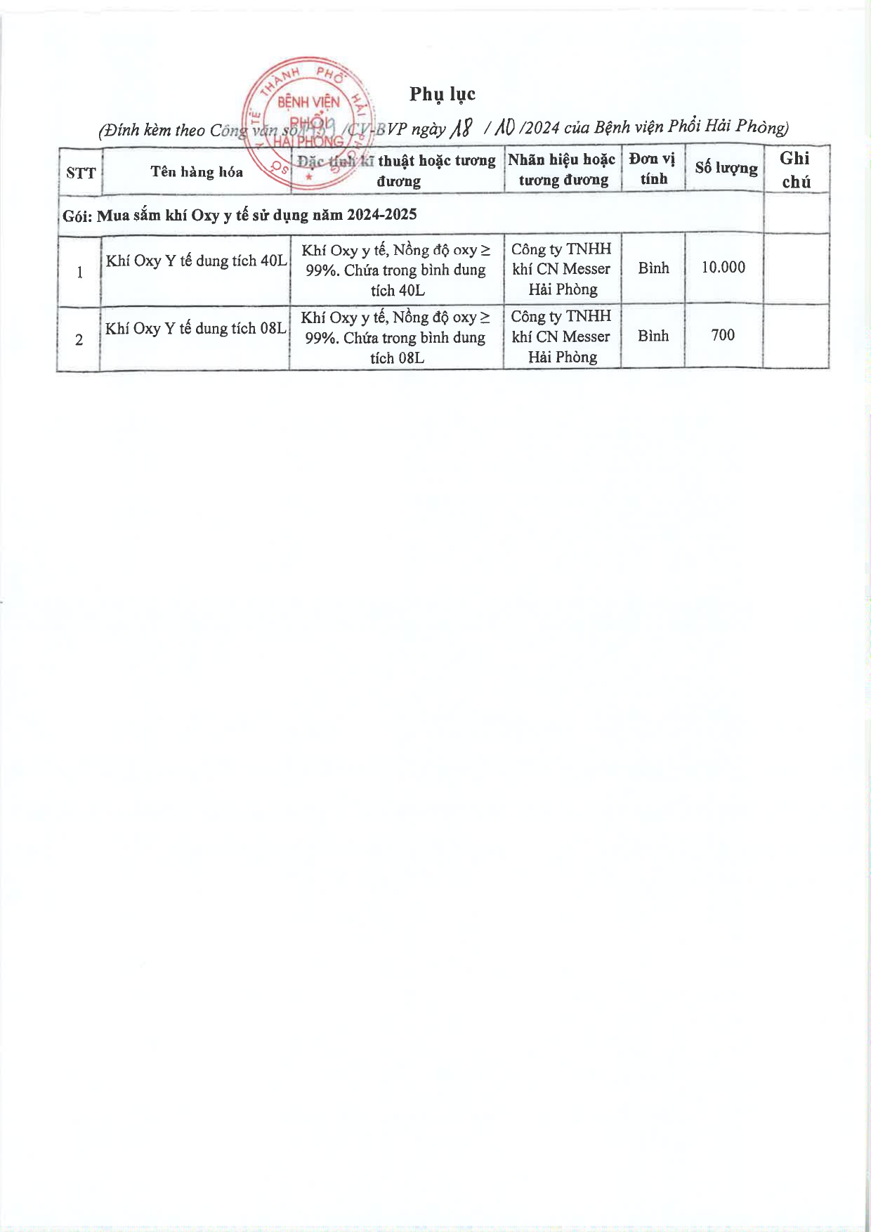 THÔNG BÁO MỜI BÁO GIÁ ĐỂ XÂY DỰNG GIÁ GÓI THẦU MUA SẮM KHÍ OXY Y TẾ PHỤC VỤ HOẠT ĐỘNG THƯỜNG XUYÊN NĂM 2024-2025 CỦA BỆNH VIỆN PHỔI HẢI PHÒNG